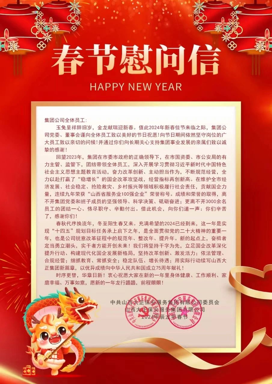 玉兔呈祥辭舊歲,金龍獻瑞迎新春。值此2024年新春佳節(jié)來臨之際,集團公司黨委、董事會謹向全體員工致以美好的節(jié)日祝愿!向節(jié)日期間依然堅守崗位的廣大員工致以親切的問候!并通過你們向長期關(guān)心支持集團事業(yè)發(fā)展的親屬們致以誠摯的感謝!