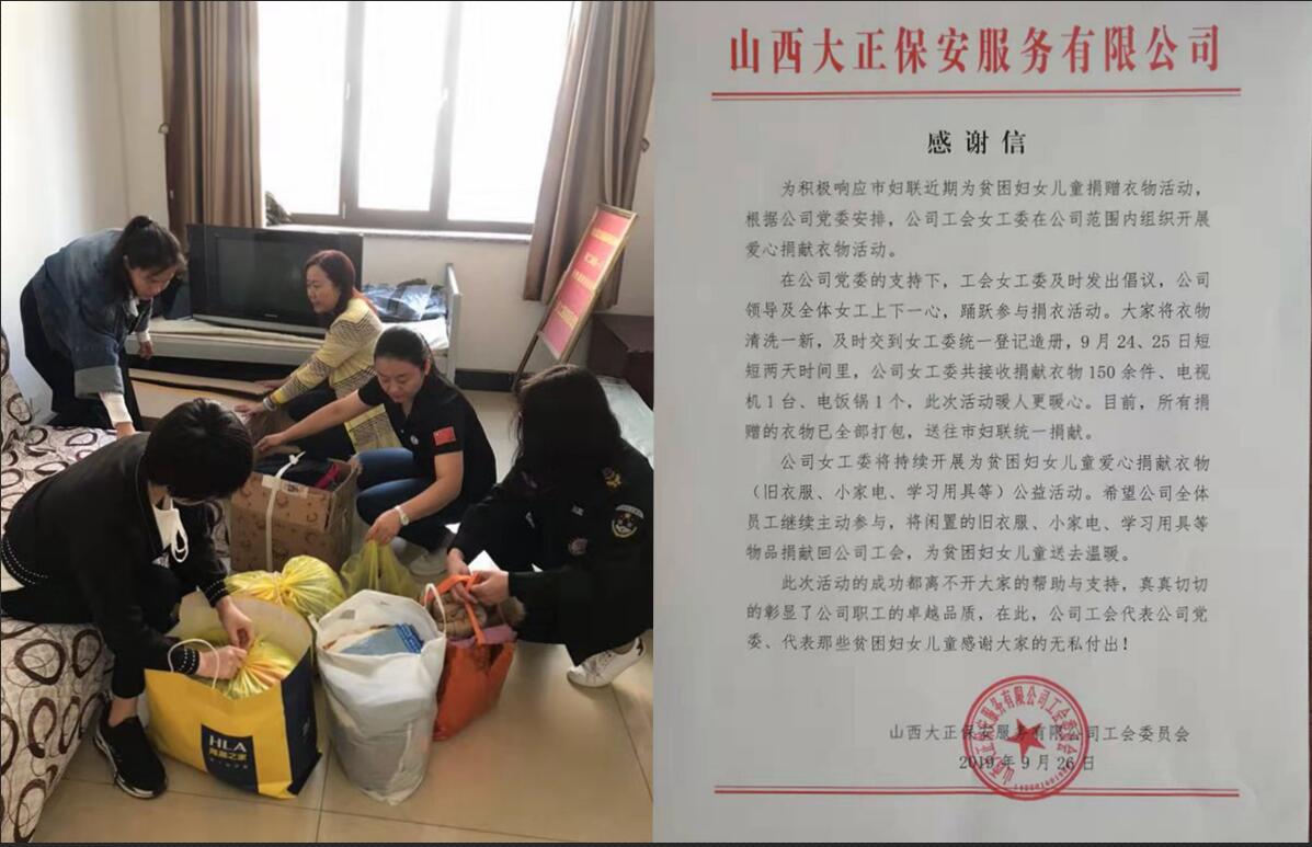 目前,在公司女工共同幫助下,所有捐贈(zèng)的衣物已全部打包,送往市婦聯(lián)統(tǒng)一捐獻(xiàn)。