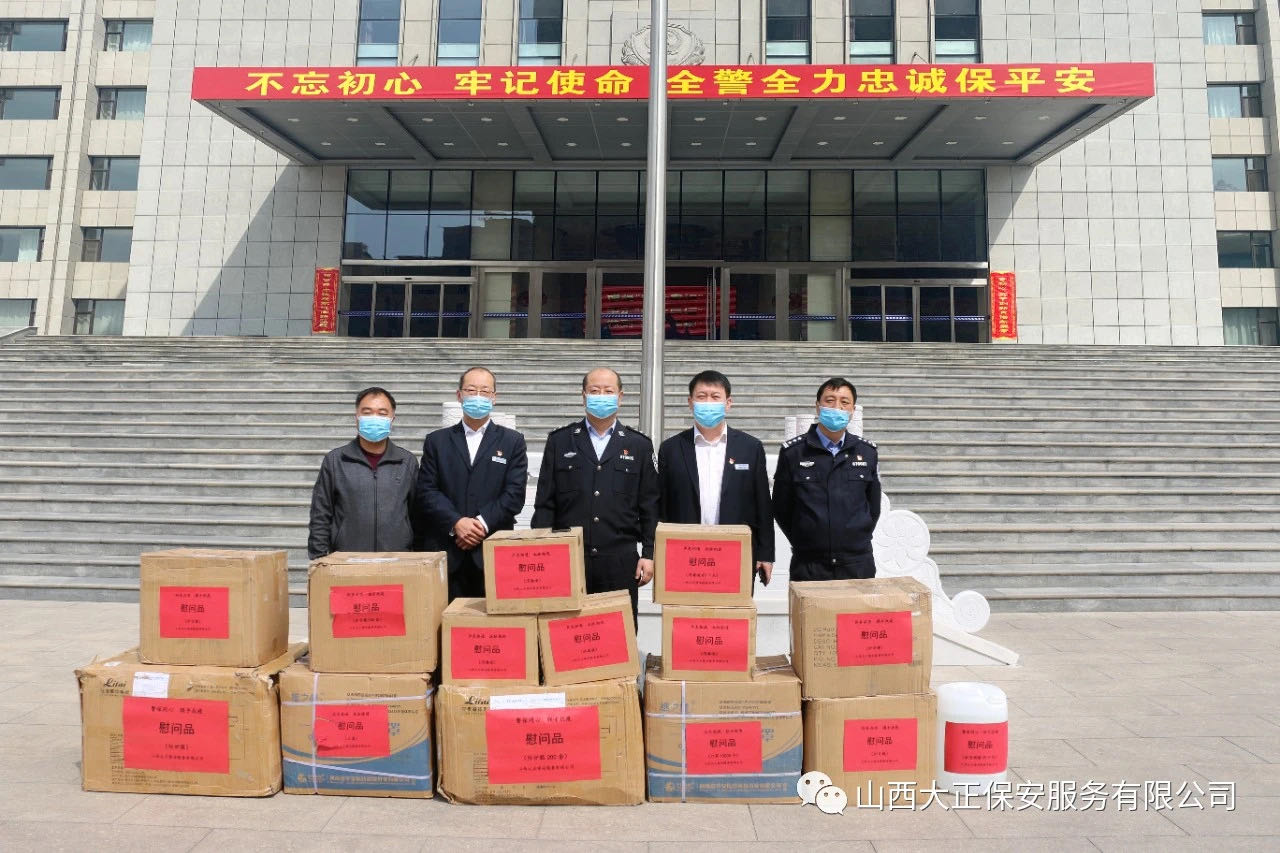 3月31日,山西大正保安服務(集團)有限公司黨委委員、副總經(jīng)理趙培宏、副總經(jīng)理王明生領導一行,專程來到市公安局,捐贈了醫(yī)用口罩12000、防護服200套、護目鏡500個、消毒液80㎏、醫(yī)用酒精25㎏,表達公司和干部職工對公安民警疫情防控的支持;對警保同心、聯(lián)手抗疫的信心、決心;對廣大公安民警健康的關愛。忻州市公安局副局長王雷接過物資后,代表市局對大正集團公司的捐贈表示感謝。