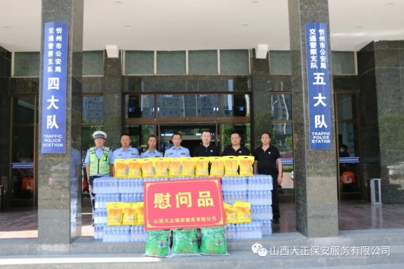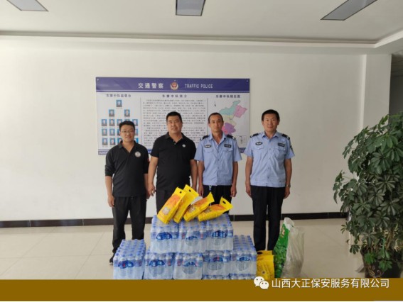 6月1日,山西大正保安服務(wù)(集團)有限公司守押四分公司軒崗中隊中隊長江達,代表公司到原平市公安局交通警察大隊軒崗交警六中隊,慰問一線執(zhí)勤交警,為烈日下辛苦執(zhí)勤的一線民警送去降溫解暑的飲用水和食物,他們頂烈日,冒酷暑,吃苦耐勞,全心全意為人民服務(wù)。呼吁全體人員向交警學(xué)習(xí),牢固樹立交通安全意識,支持交警工作,做遵守交通法規(guī)的遵守者和守護者。