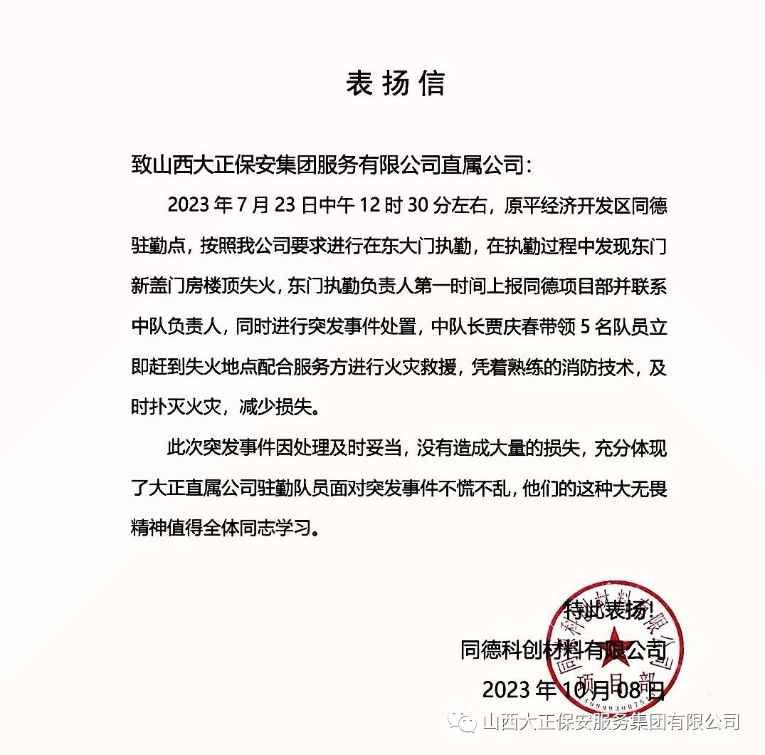2023年10月8日,山西大正保安服務(wù)集團(tuán)有限公司收到一封來自原平經(jīng)開區(qū)同德科創(chuàng)材料有限公司的表揚(yáng)信,對原平經(jīng)開區(qū)同德對駐勤點(diǎn)全體隊員的工作提出表揚(yáng)。