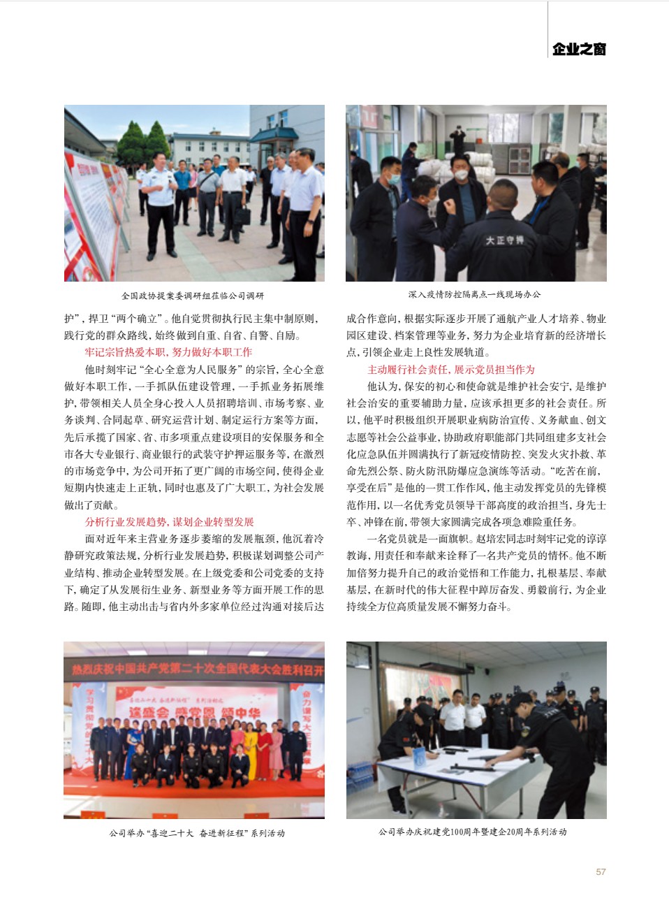 近日,《山西企業(yè)家》雜志第40期(2022年12月號(hào))以《履職盡責(zé)展擔(dān)當(dāng)謀劃轉(zhuǎn)型再出發(fā)》為題,刊發(fā)了對(duì)山西大正保安服務(wù)集團(tuán)有限公司黨委副書記、總經(jīng)理趙培宏的專題報(bào)道:
